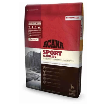 Croquettes Acana Heritage Sport & Agility pour chiens actifs et athlétiques , saveur : volailles élevées en plein air, ½ufs et plie à grande bouche de l’île de Vancouver. Sac de 11,4 kg….