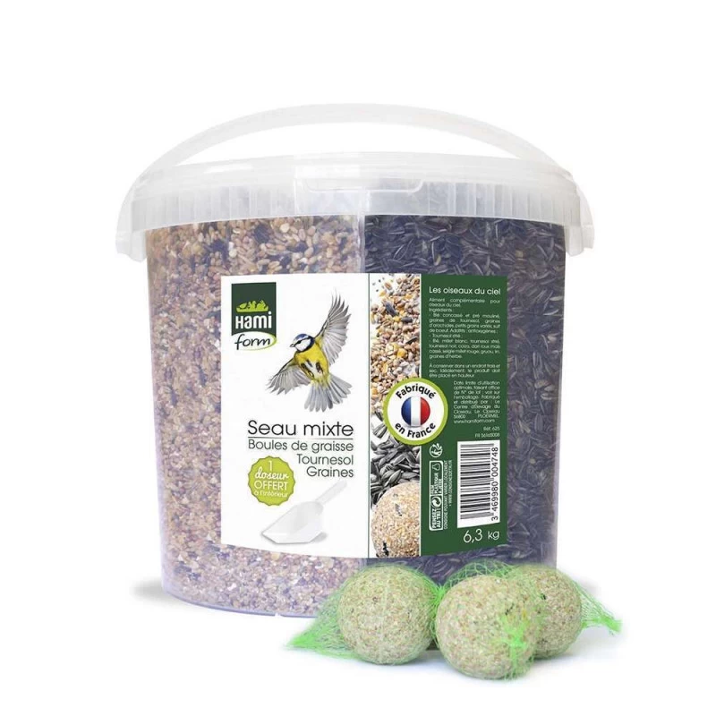 Tout en aidant les oiseaux à passer plus sereinement l’hiver, vous pourrez vous réjouir des les observer quotidiennement, grâce au contenu de ce seau de graines et de boules de graisse….